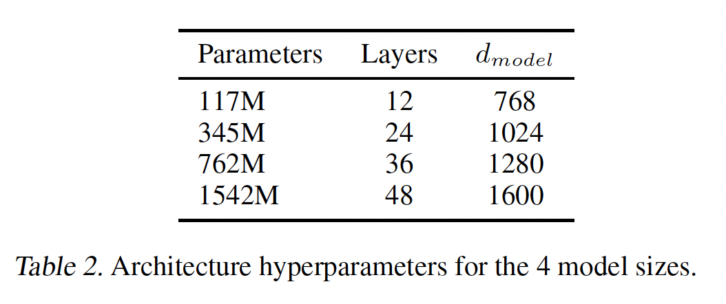 We trained and benchmarked four LMs with approximately log-uniformly spaced sizes. The architectures are summarized in Table 2. The smallest model is equivalent to the original GPT, and the second smallest equivalent to the largest model from BERT[DCLT19]. Our largest model, which we call GPT-2, has over an order of magnitude more parameters than GPT.