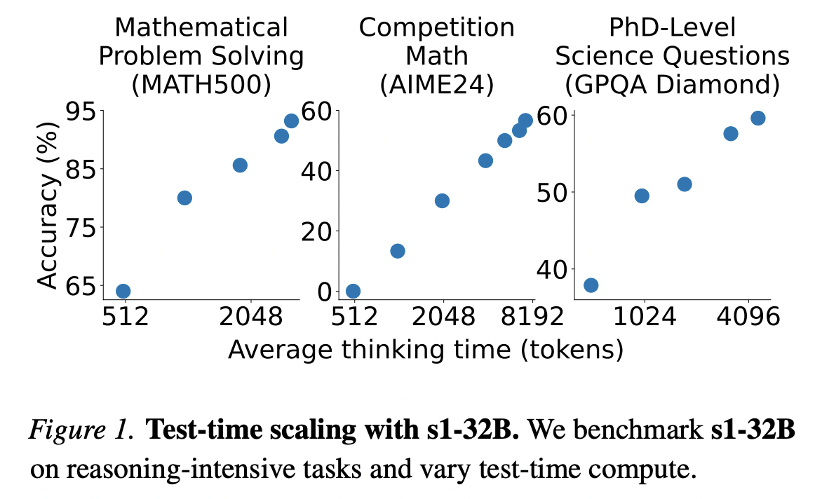 difficulty,diversity, andquality.We develop budget forcing to control test-time compute by forcefully terminating the model’s thinking process or lengthening it by appending “Wait” multiple times to the model’s generation when it tries to end.