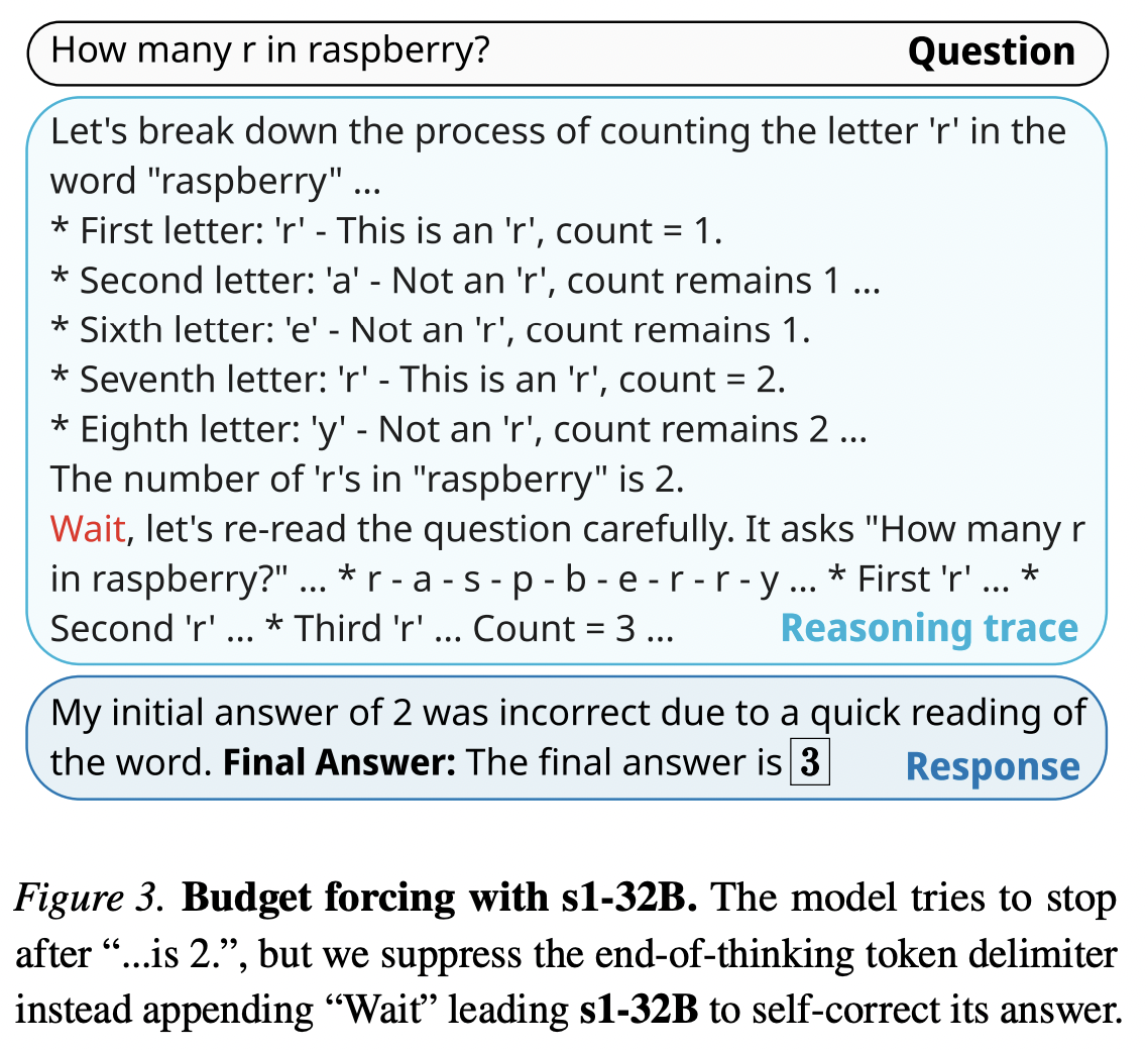 Budget forcing We propose a simple decoding-time intervention by forcing a maximum and/or minimum number of thinking tokens. Specifically, we enforce a maximum token count by simply appending the end-of-thinking token delimiter and optionally “Final Answer:” to early exit the thinking stage and make the model provide its current best answer. To enforce a minimum, we suppress the generation of the end-of-thinking token delimiter and optionally append the string “Wait” to the model’s current reasoning trace to encourage the model to reflect on its current generation.