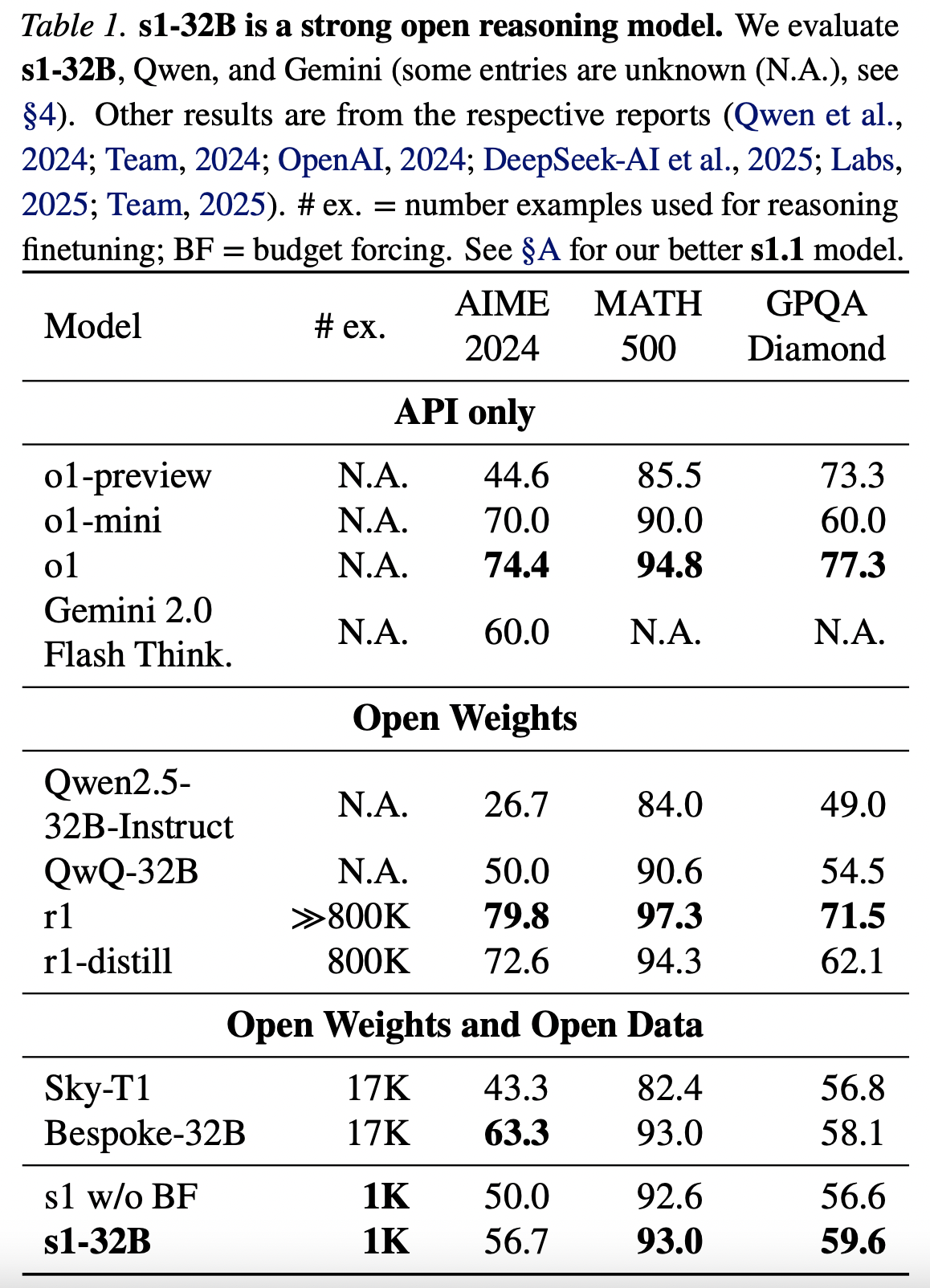 After supervised finetuning the Qwen2.5- 32B-Instruct language model on s1K and equipping it with budget forcing, our model s1-32B exceeds o1-preview on competition math questions by up to 27% (MATH and AIME24).