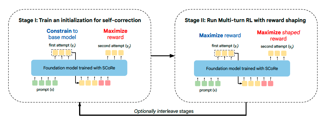 stage 2: trains responses at both attempts towards optimizing reward, and reward shaping to incentivize self-correction.