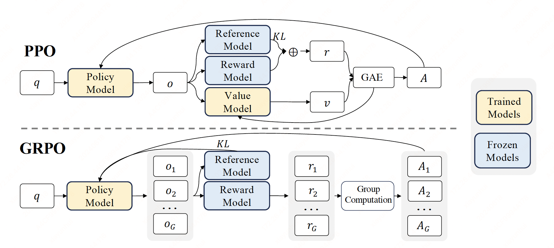 where \(\epsilon\) and \(\beta\) are hyper-parameters, and \(\hat{A}_{i,t}\) is the advantage calculated based on relative rewards of the outputs inside each group only. Also note that, instead of adding KL penalty in the reward, GRPO regularizes by directly adding the KL divergence between the trained policy and the reference policy to the loss, avoiding complicating the calculation of \(\hat{A}_{i,t}\). And different from the KL penalty term used in PPO, we estimate the KL divergence with the following unbiased estimator:
