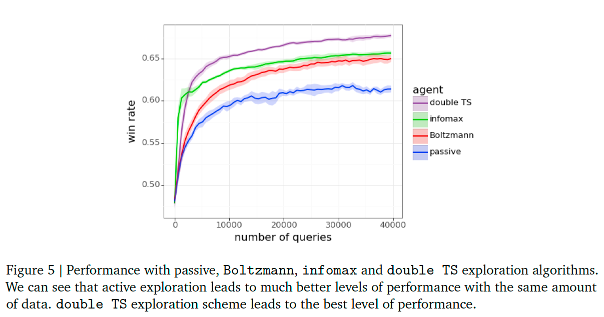 We refer to the standard practice of sampling each pair of responses using the language model as passive exploration. We compare the performance of passive exploration to several active exploration algorithms. One is Boltzmann exploration, which tends to select responses with higher predicted reward. By active exploration we mean the tailoring of interactions to elicit useful feedback. Our results demonstrate that high levels of performance can be attained with far less feedback.