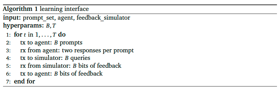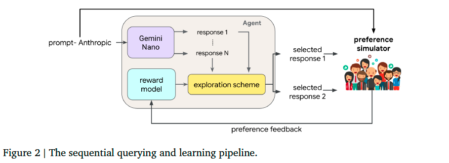 In our experiments, at the start of each epoch of interaction, each agents receives a batch of \(B\) = 32 prompts and then, for each prompt, generates a pair of responses to form a query. Each agent’s \(B\) = 32 queries are submitted to the preference simulator, yielding \(B\) = 32 bits of feedback. Each agent inserts its batch of \(B\) = 32 data points into its replay buffer. The replay buffers are first-in-first-out (FIFO) buffer, with a maximum capacity of \(C\) = 3200 data points. Recall that each exploration algorithm selects each pair of responses from 𝑁 candidates sampled by Gemini Nano. In our experiments, we set \(N\) = 100.