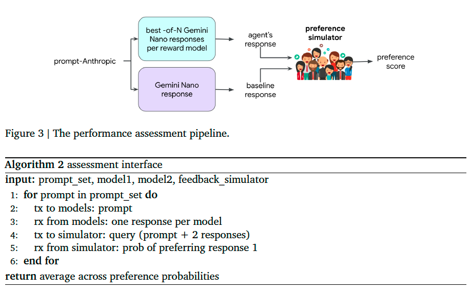A sequence of prompts is sampled from Anthropic Helpfulness Base eval dataset. For each, two responses are sampled. One by Gemini Nano and the other by a new response generation model that uses the learned reward model. This new model operates by sampling \(N\) responses using Gemini Nano and then selecting the one that scores highest according to the agent’s reward model.