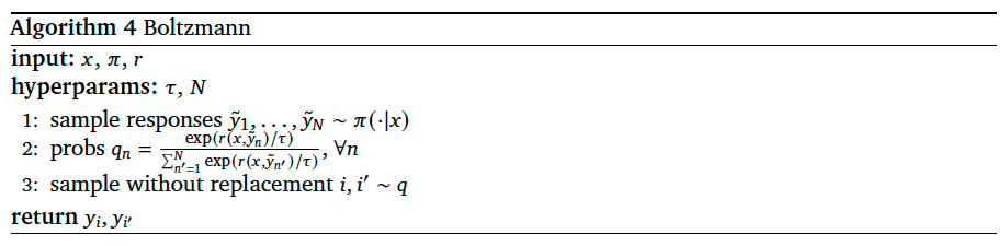 As presented in Algorithm 4, in addition to the inputs \(x\) and \(\pi\) used for passive exploration, Boltzmann exploration requires a point estimate reward model \(r\). Further, there are two hyperparameters: a temperature \(\tau\) and a response set cardinality \(N\).