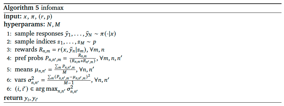 Like Boltzmann exploration, infomax begins with the language model generating \(N\) responses. Then, \(M\) epistemic indices are sampled from \(p\). For each pair of responses and each epistemic index, the ENN assigns a probability to the event that a random human rater prefers the first response over the second. Infomax assesses uncertainty about this probability by calculating a sample variance across the \(M\) epistemic indices. Then, the algorithm selects the pair of responses to maximize uncertainty.