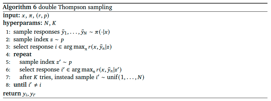 We begin by sampling \(N\) responses. Then, two among these \(N\) responses are selected by sampling two epistemic indices from \(p\) and maximizing across rewards prescribed by each. In the event that samples are identical, the second response is resampled until it differs. If there is no difference after \(K\) iterations, the second response is instead sampled uniformly.