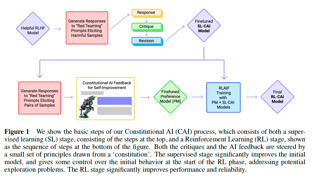We develop a method we refer to as Constitutional AI (CAI), depicted in the Figure 1, and use it to train a non-evasive and relatively harmless AI assistant, without any human feedback labels for harms.