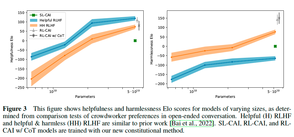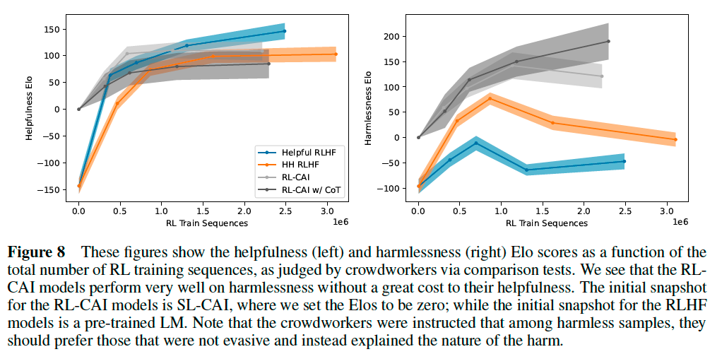 In Figure 8, we show Elo scores for various snapshots of all the RL runs. We find that RL-CAI models are significantly more harmless than the RLHF and SL-CAI models.