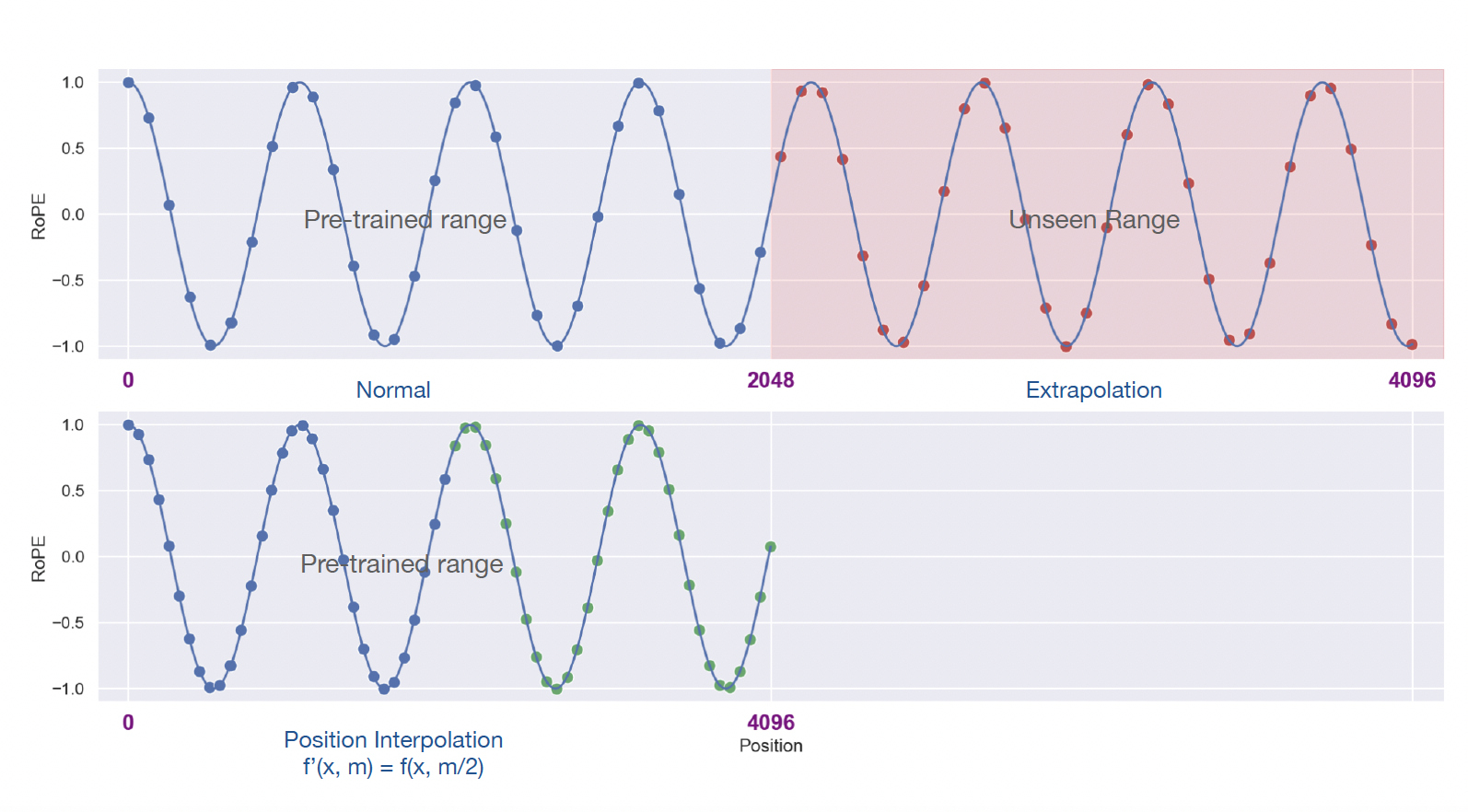 在低维度上旋转角度较大,意味着这些维度上的信号变化非常迅速,能够精细地区分相邻位置。如果在低维度进行内插,对用低维区分不同位置间的能力影响更大,这种现象称之为高频信息的损失。因此我们可采用高频外推,低频内插的方式。