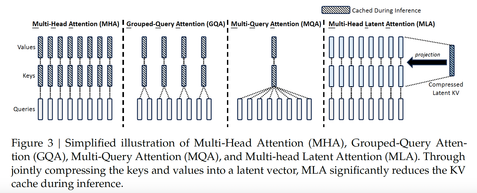 During inference, all keys and values need to be cached to accelerate inference (the keys and values need to be computed only once), so MHA needs to cache \(2n_{h}d_{h}l\) (\(l\) denote layer num) elements for each token. In